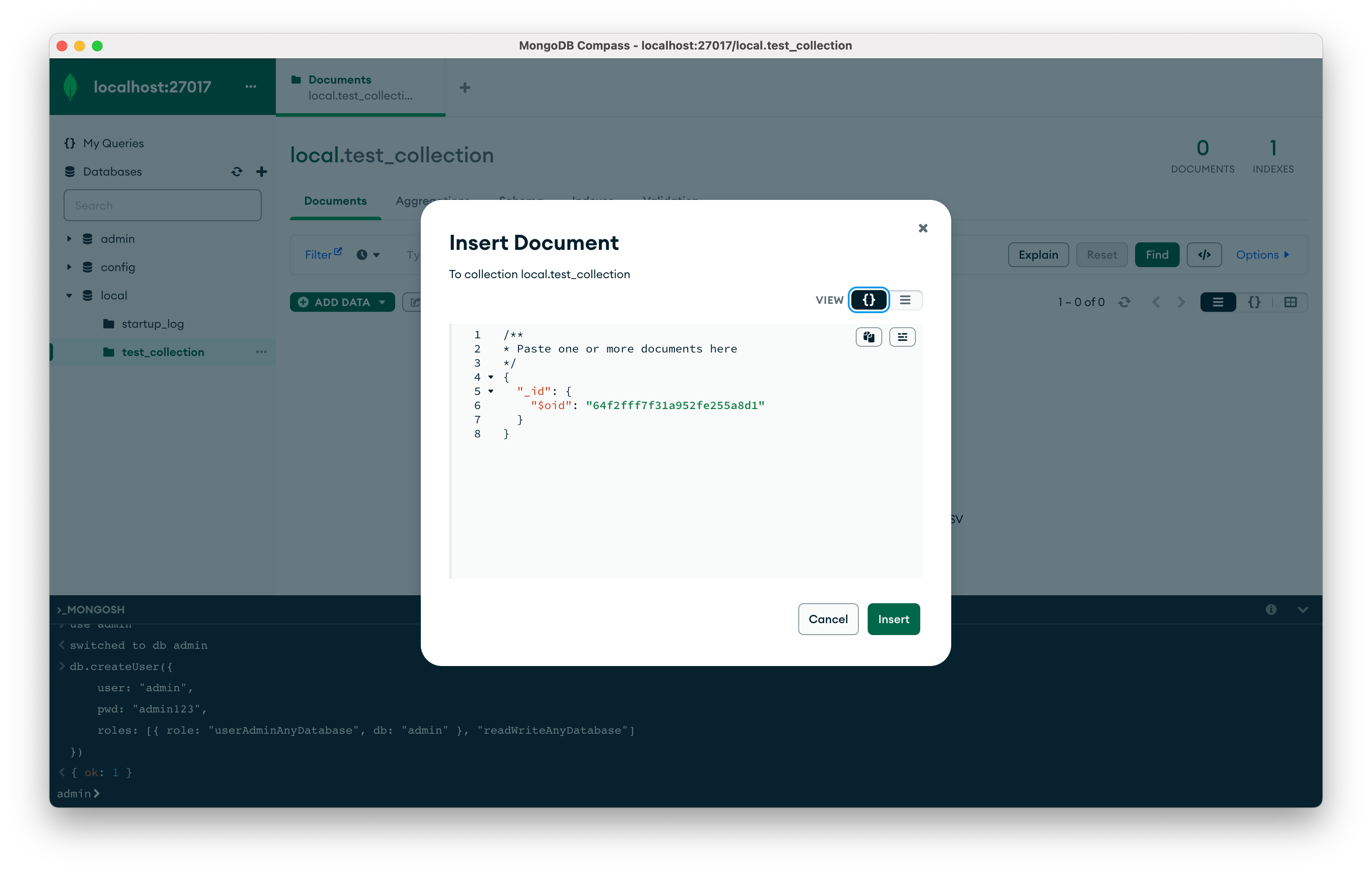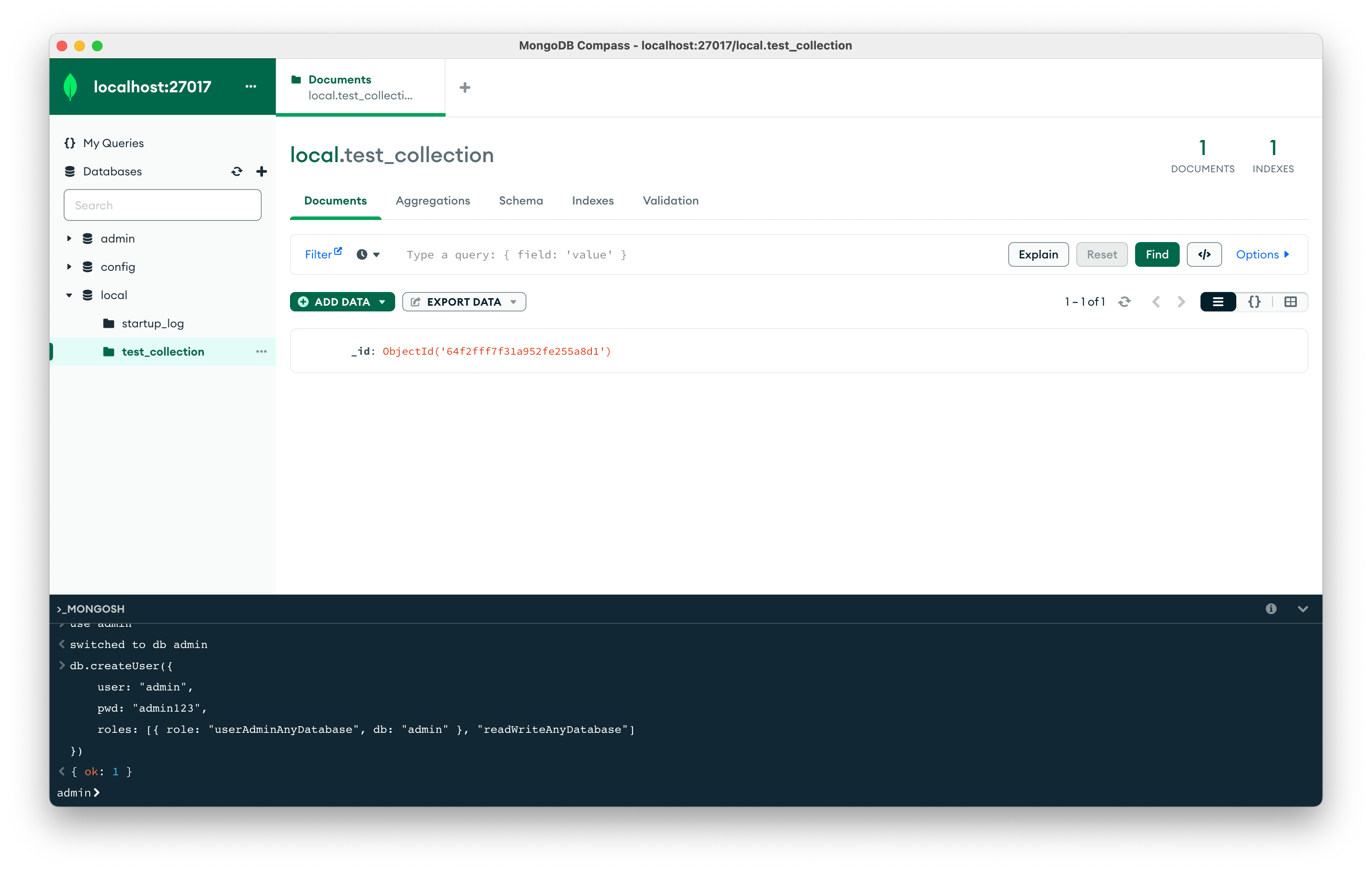이렇게 bash shell 로 접속한 mongo와 Mongo Compass가 서로 잘 상호동작하는지 확인해보기 위해, 데이터를 생성하고 조회하였다.