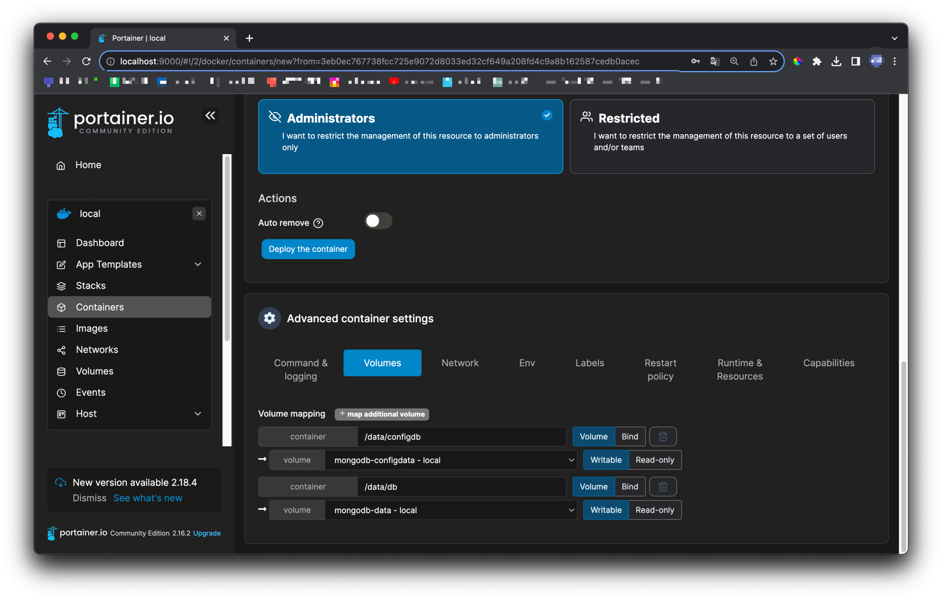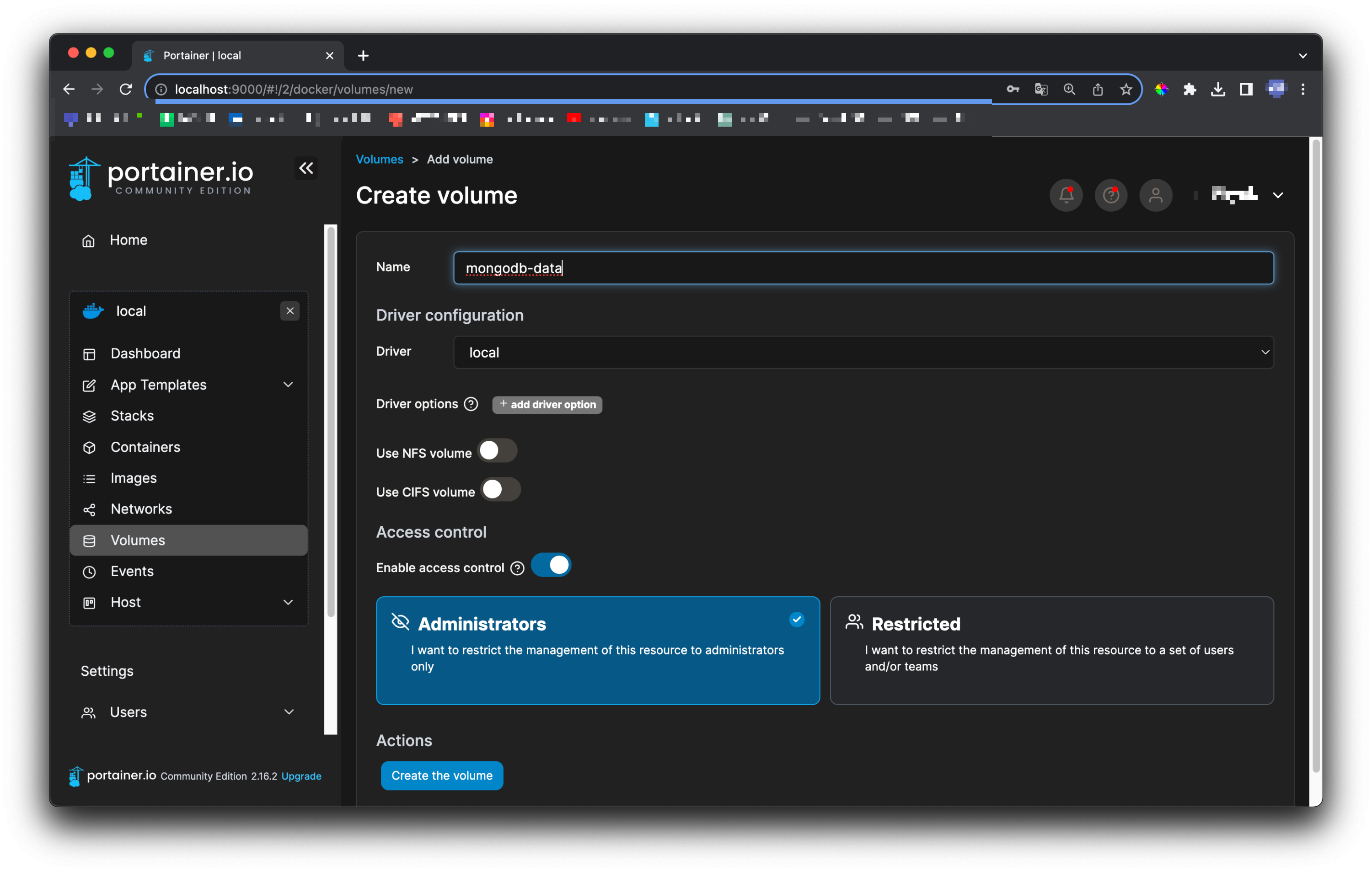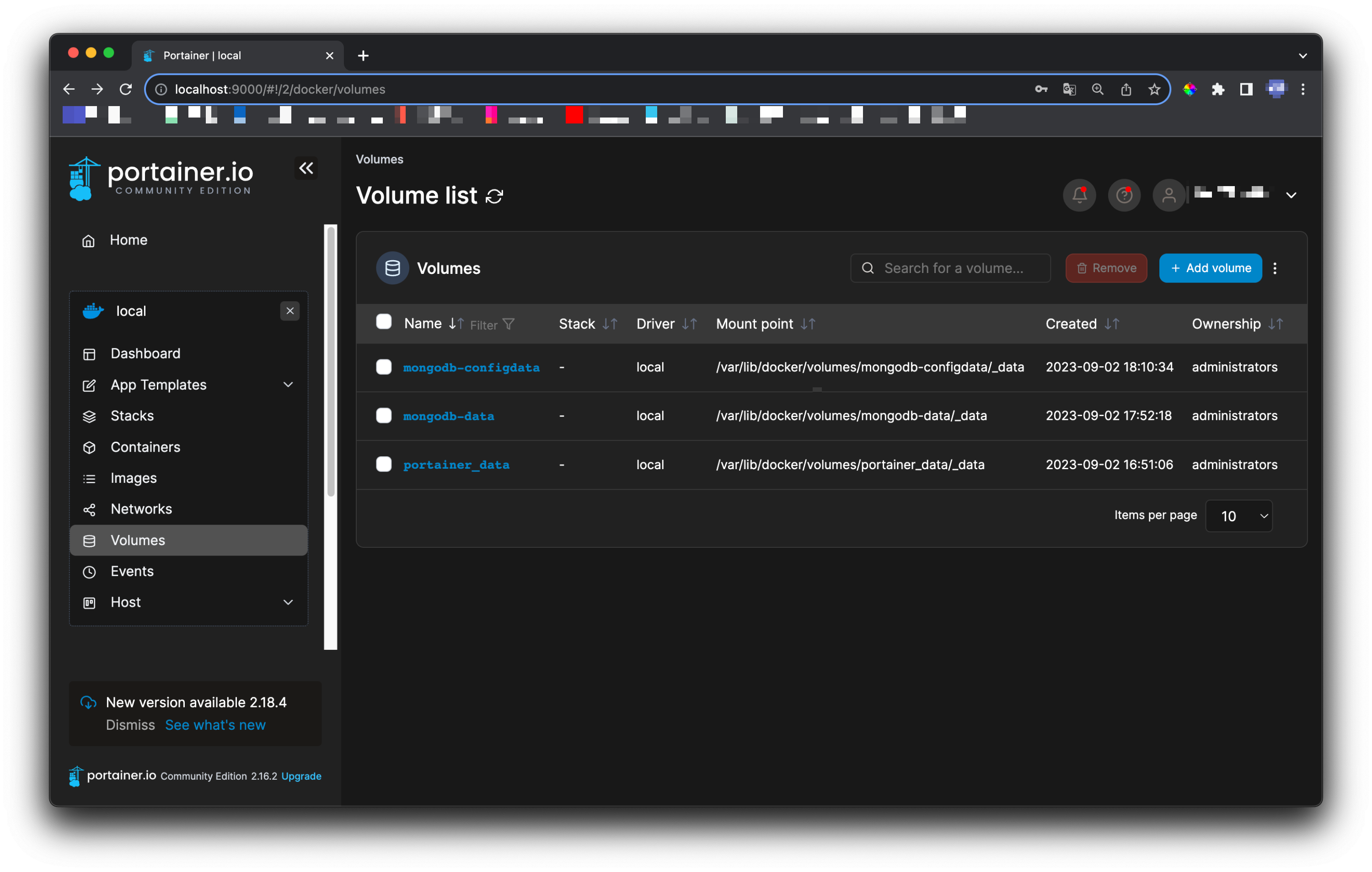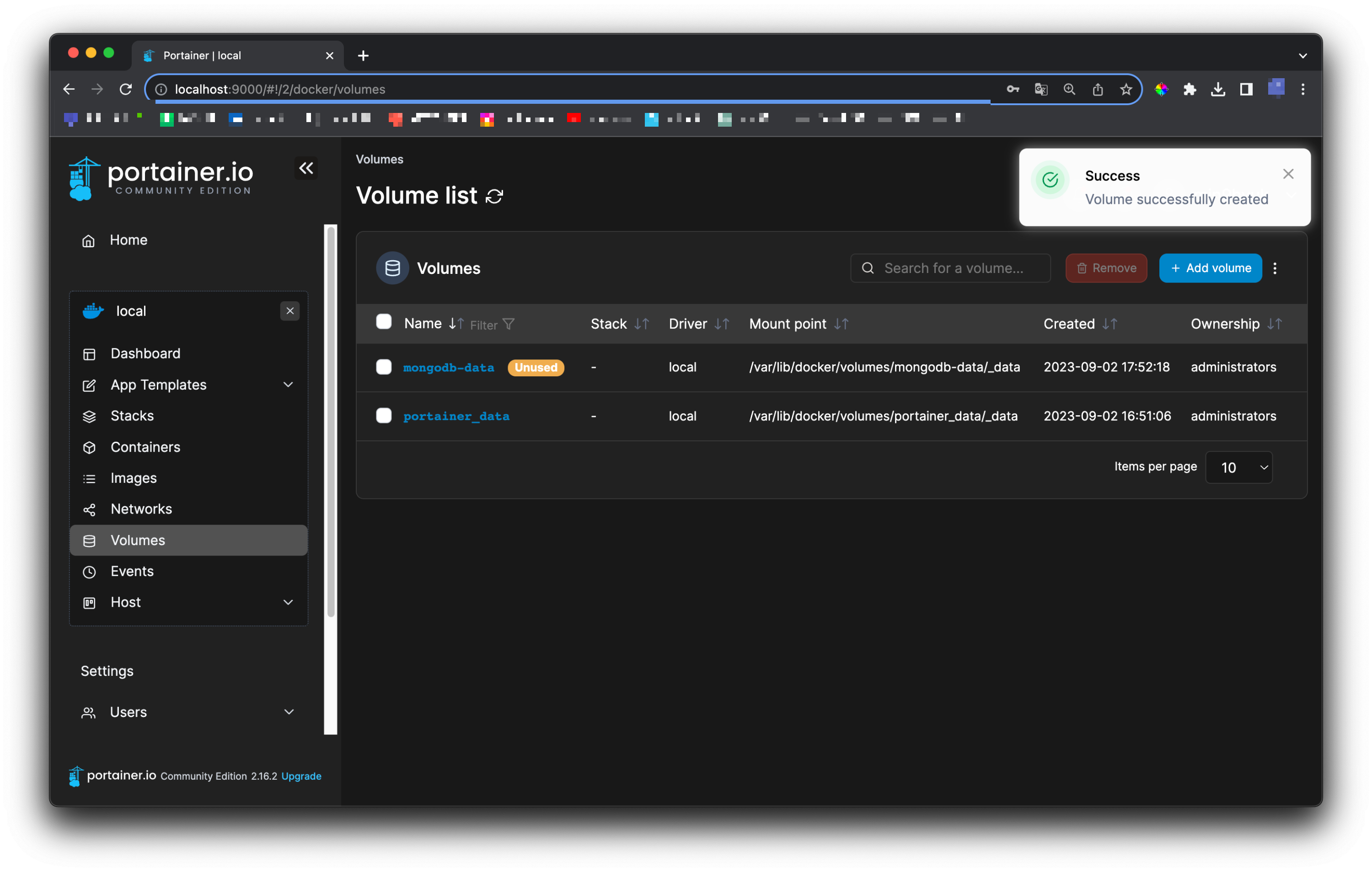 우측 상단에 Success라고 적혀진 토스트를 볼 수 있고, Volume list에도 정상적으로 mongodb-data 볼륨이 생성된 것을 볼 수 있다.