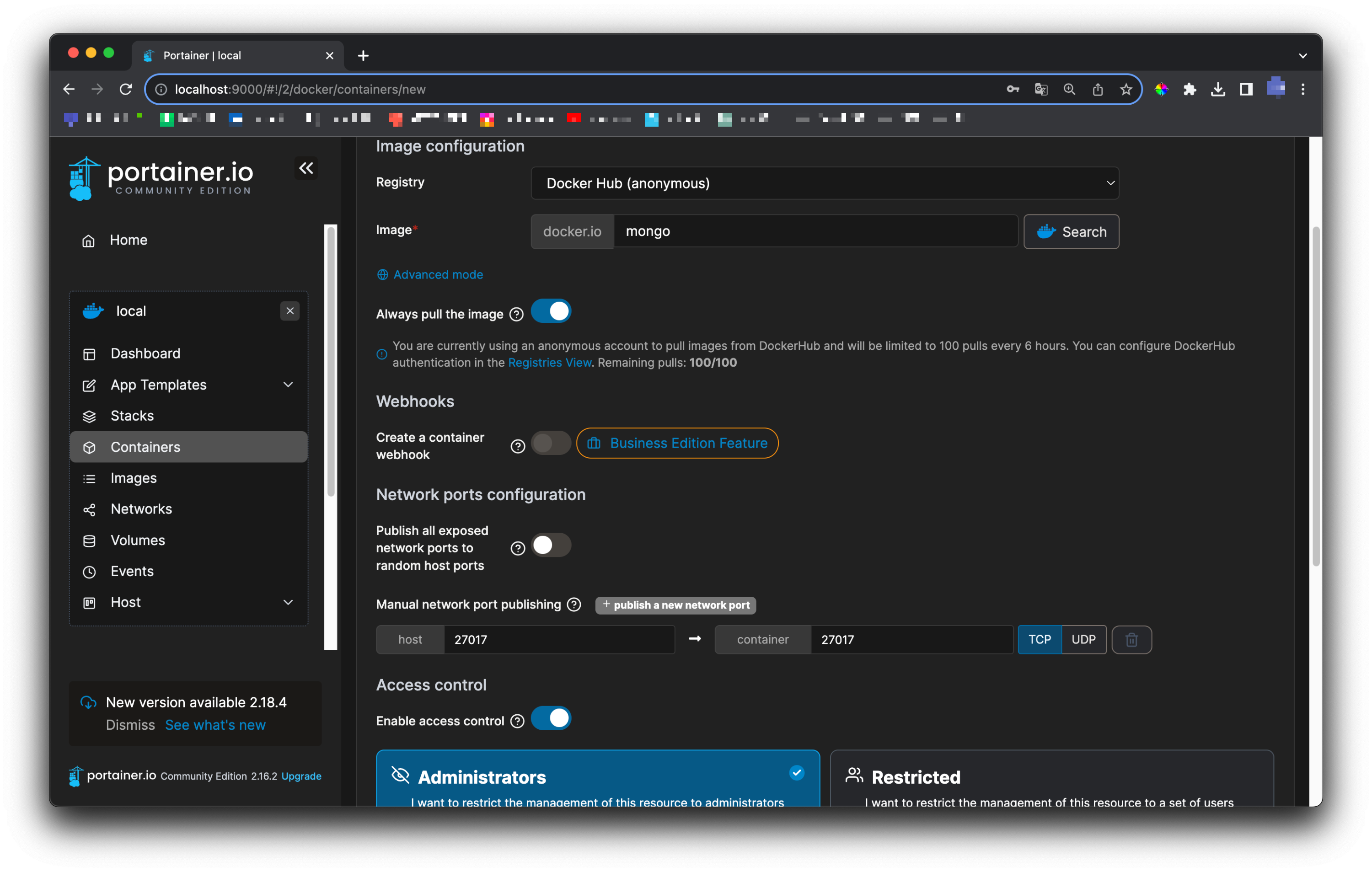 그 후 Manul netwokr port publishing 칸에 host와 container의 사용 포트번호를 27017로 지정하였다.
