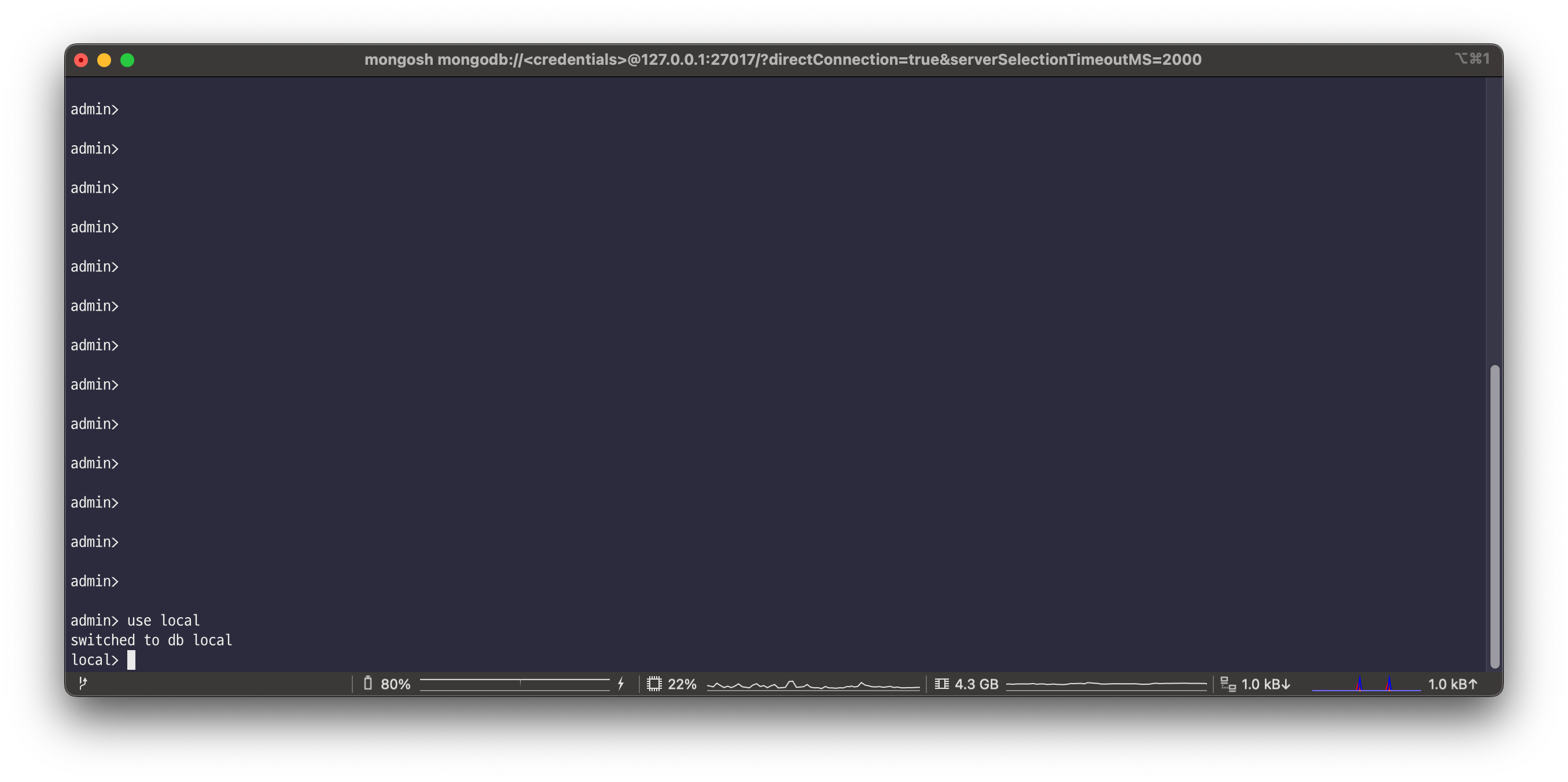 정상적으로 Mongo 에 접속했다면 위와 같은 화면을 볼 수 있다. 여기서 use 명령어를 사용하여 접속 계정을 admin으로 바꿔주었다.