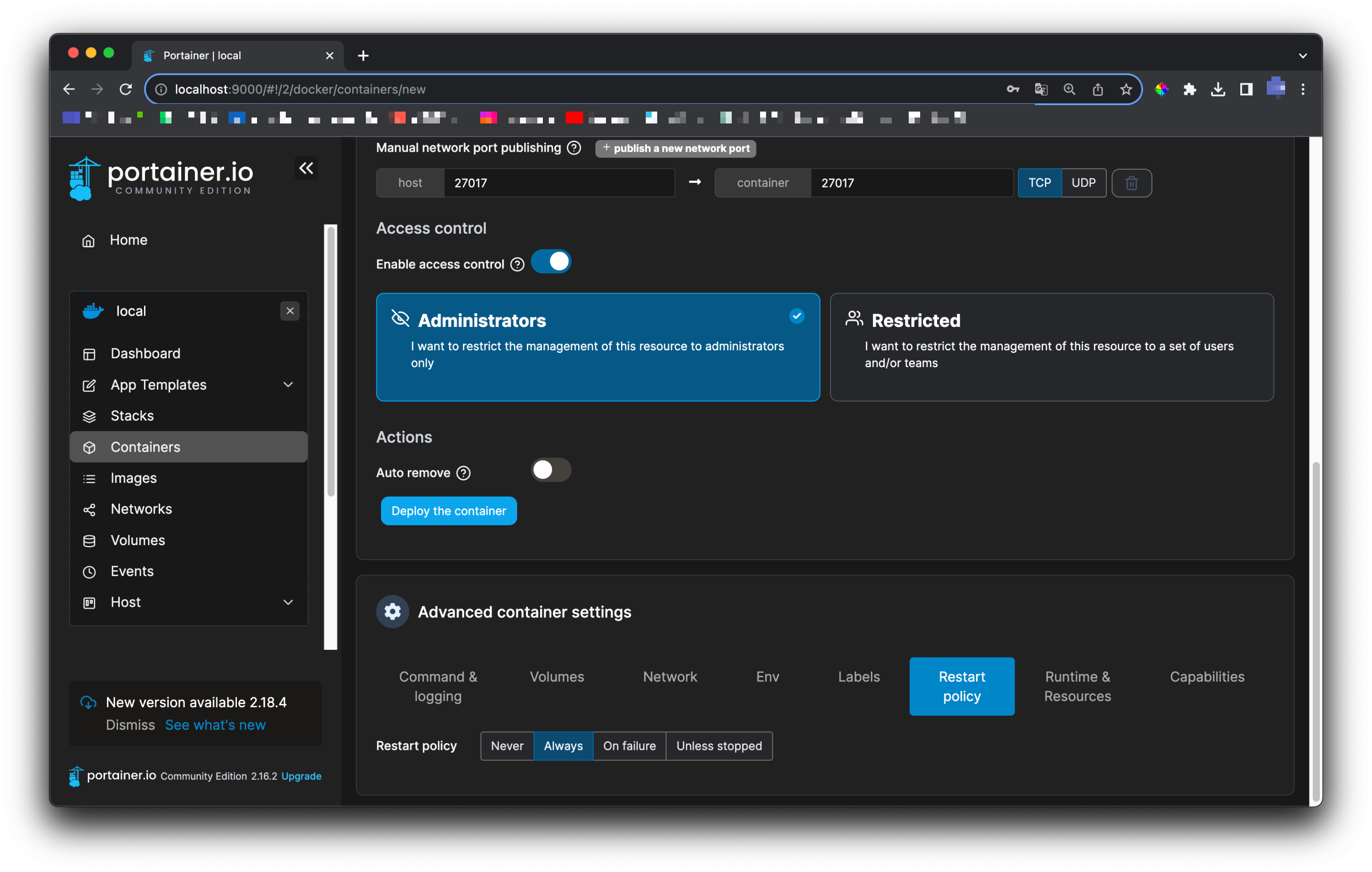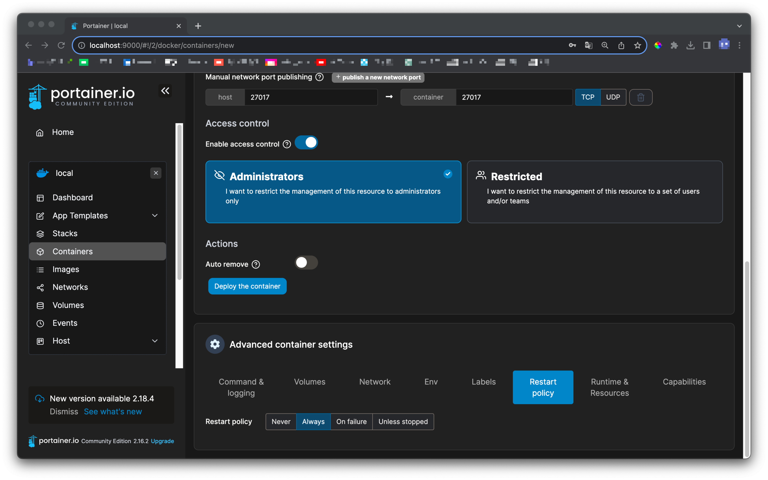그 후 Advanced container settings 란의 Restart policy 탭에서 Restart policy를 Always로 선택하였다.