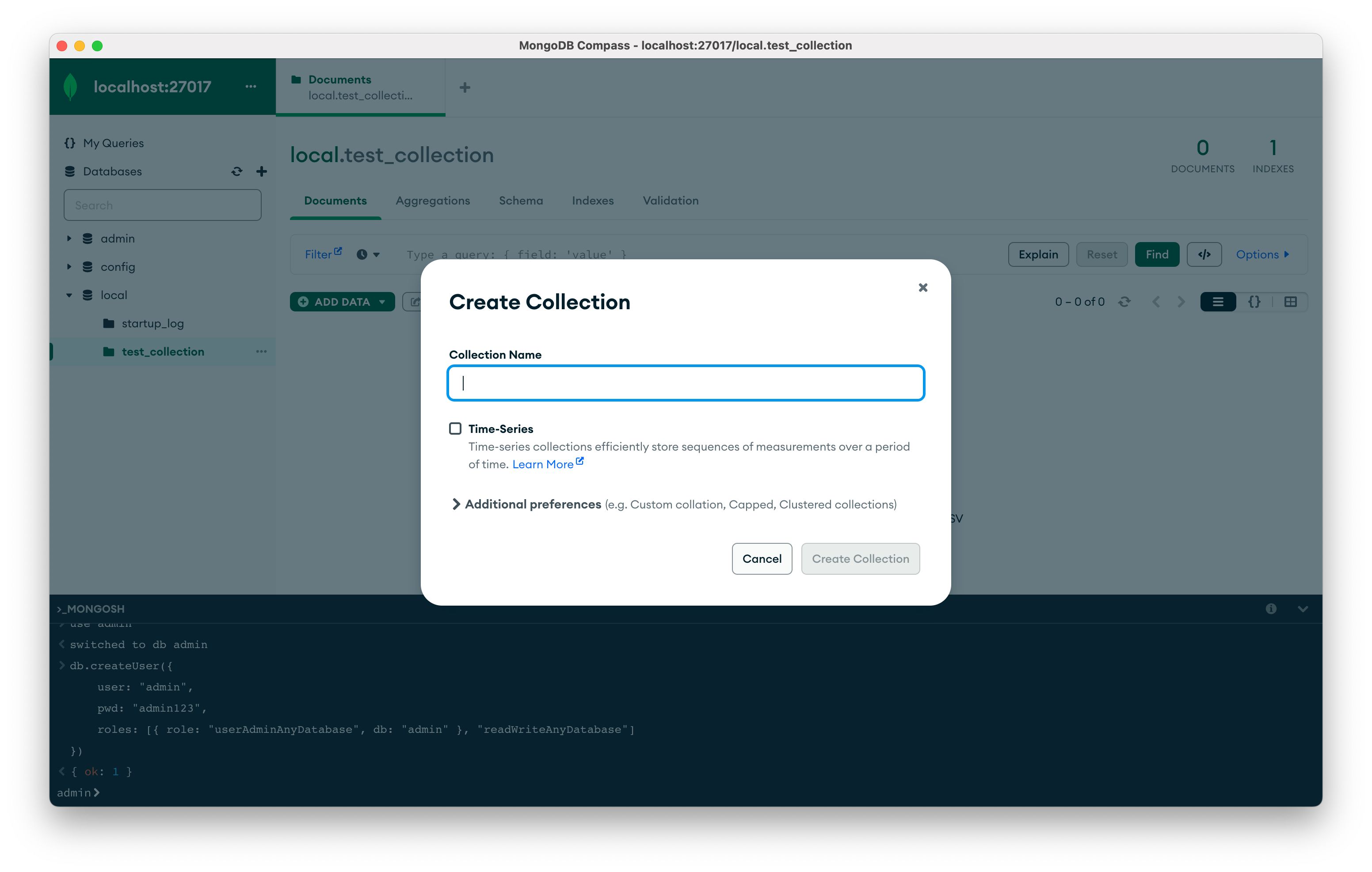 먼저 Mongo Compass에서 local 계정으로 test_collections이라는 신규 컬렉션을 생성하였다.