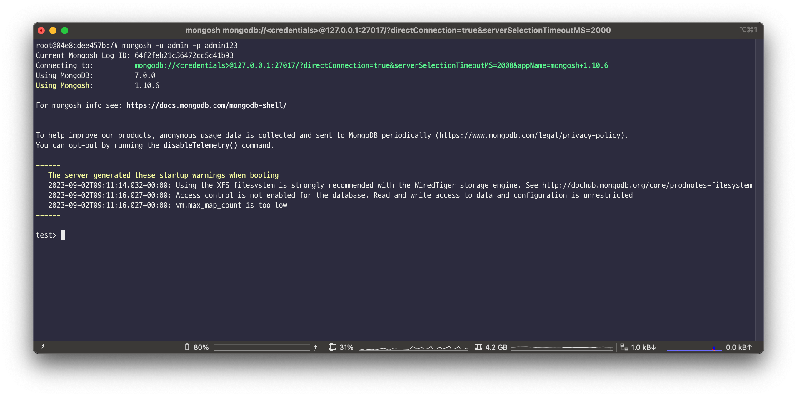 그 후 다시 도커 컨테이너를 접속한 bash 쉘로 돌아와서 mongsh 명령어를 통해 앞서 생성한 admin 계정으로 몽고 DB에 접속하였다.