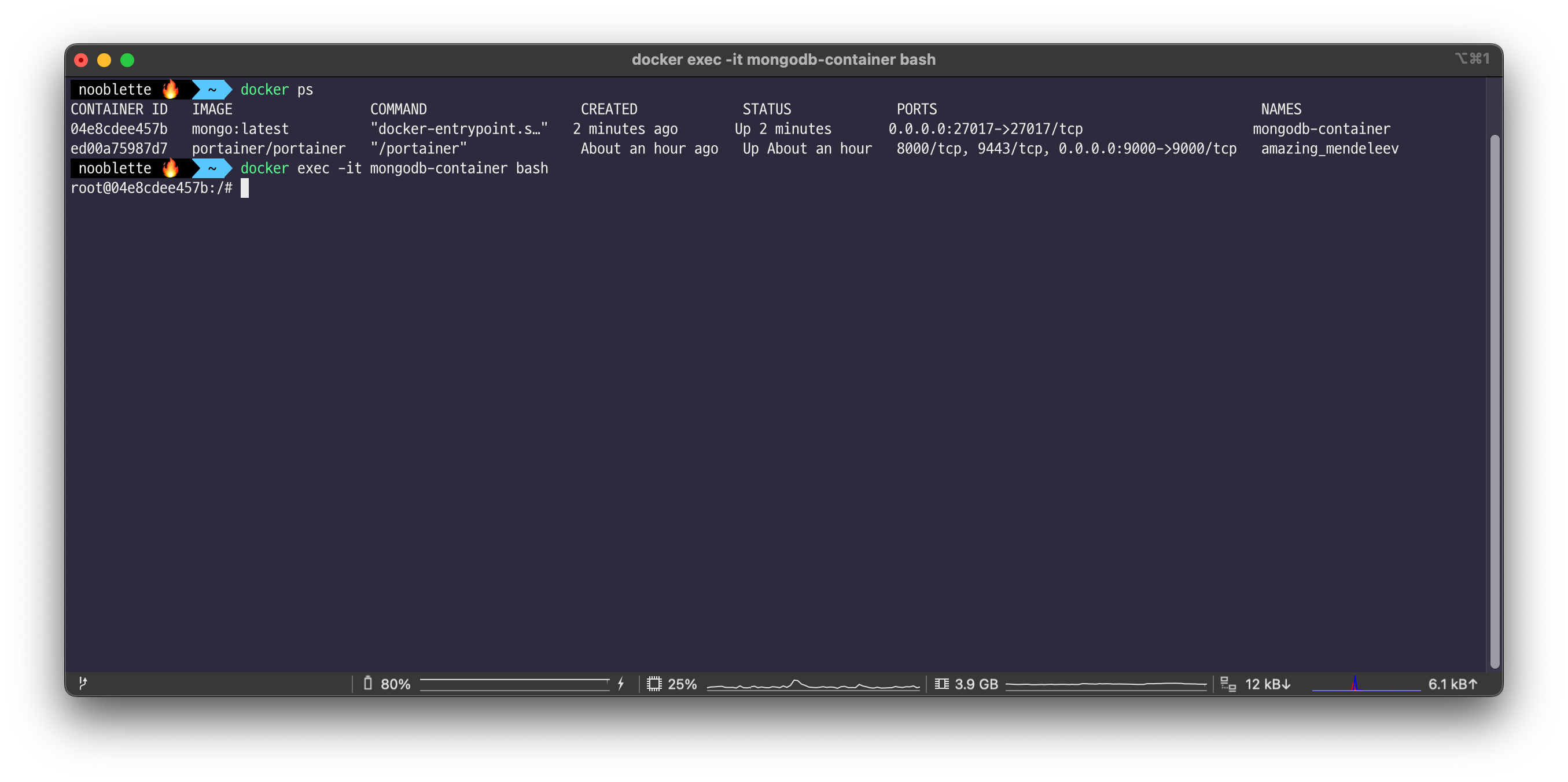 앞서 생성해두었던 mongo-data 볼륨과 mongodb-configdata 볼륨에 각각 Mongo 컨테이너의 /data/db 디렉토리와 /data/configdb 디렉토리를 마운트하였다.