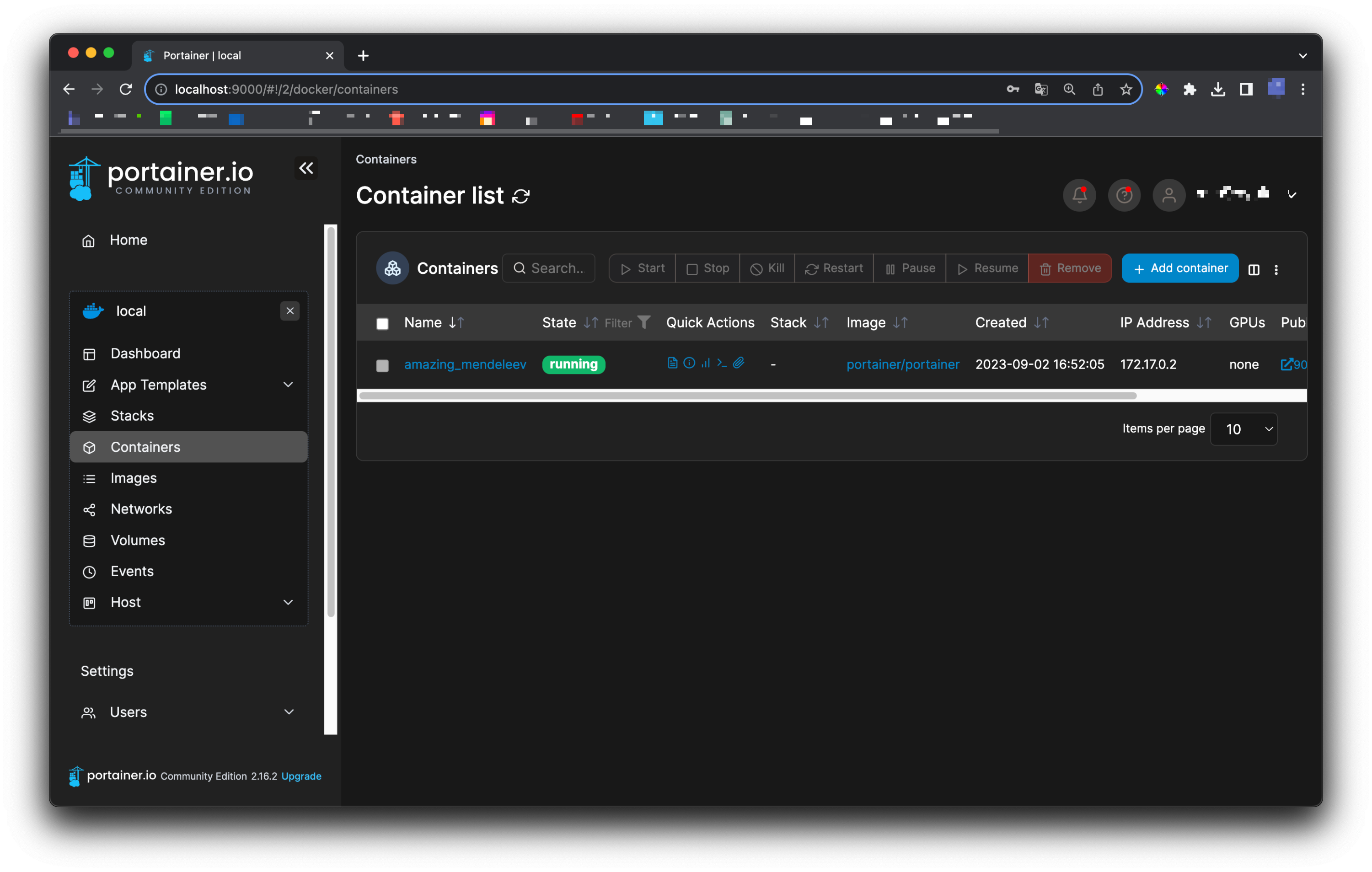 Mongo image를 pull하고, data를 마운트할 volume까지 생성한 후에 도커 컨테이너를 생성하였다. 마찬가지로 우측 상단에 Add Container를 통해 생성하였다.