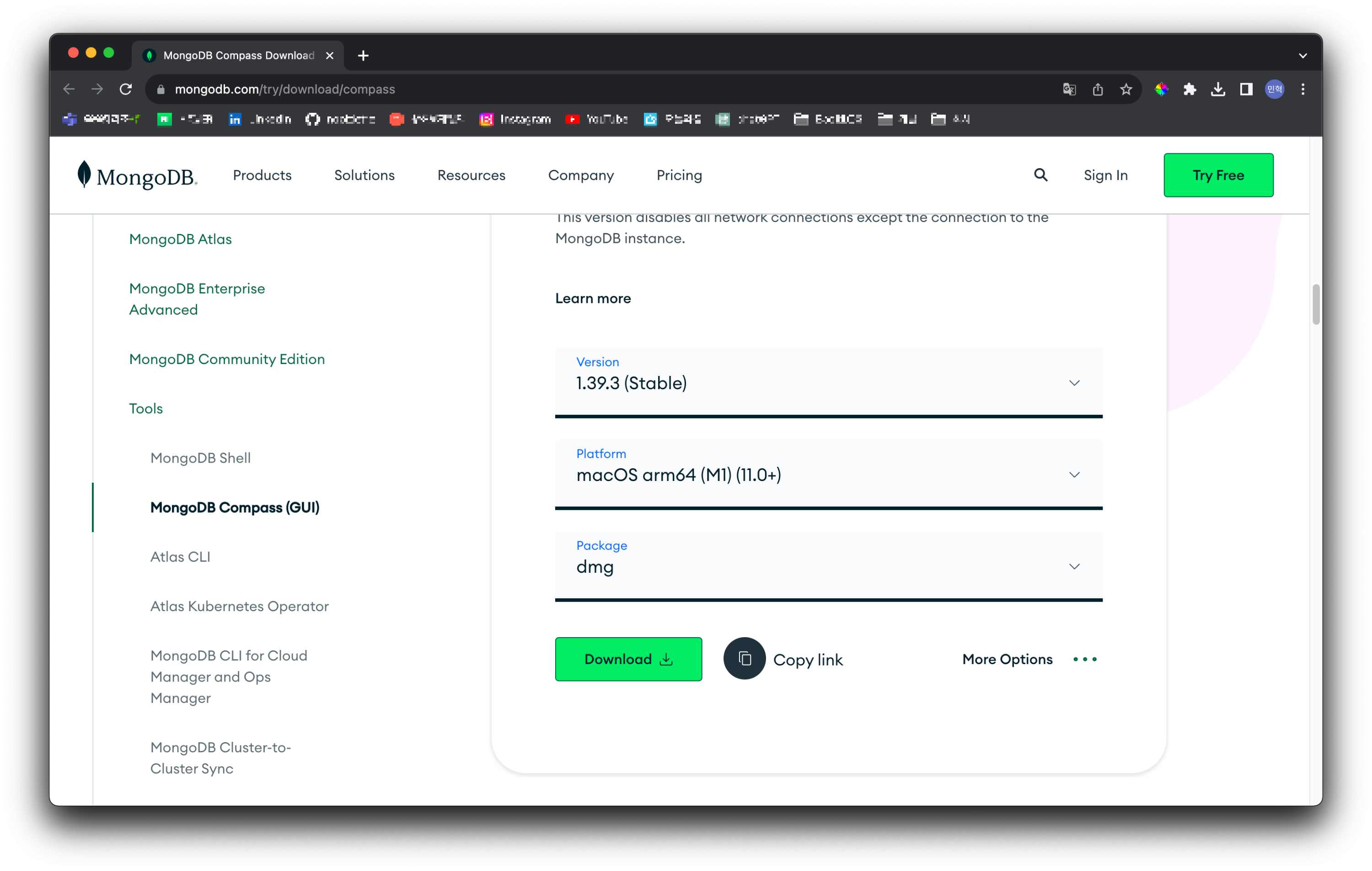 mongo compass는 mongo 공식 사이트에서 설치하였다.