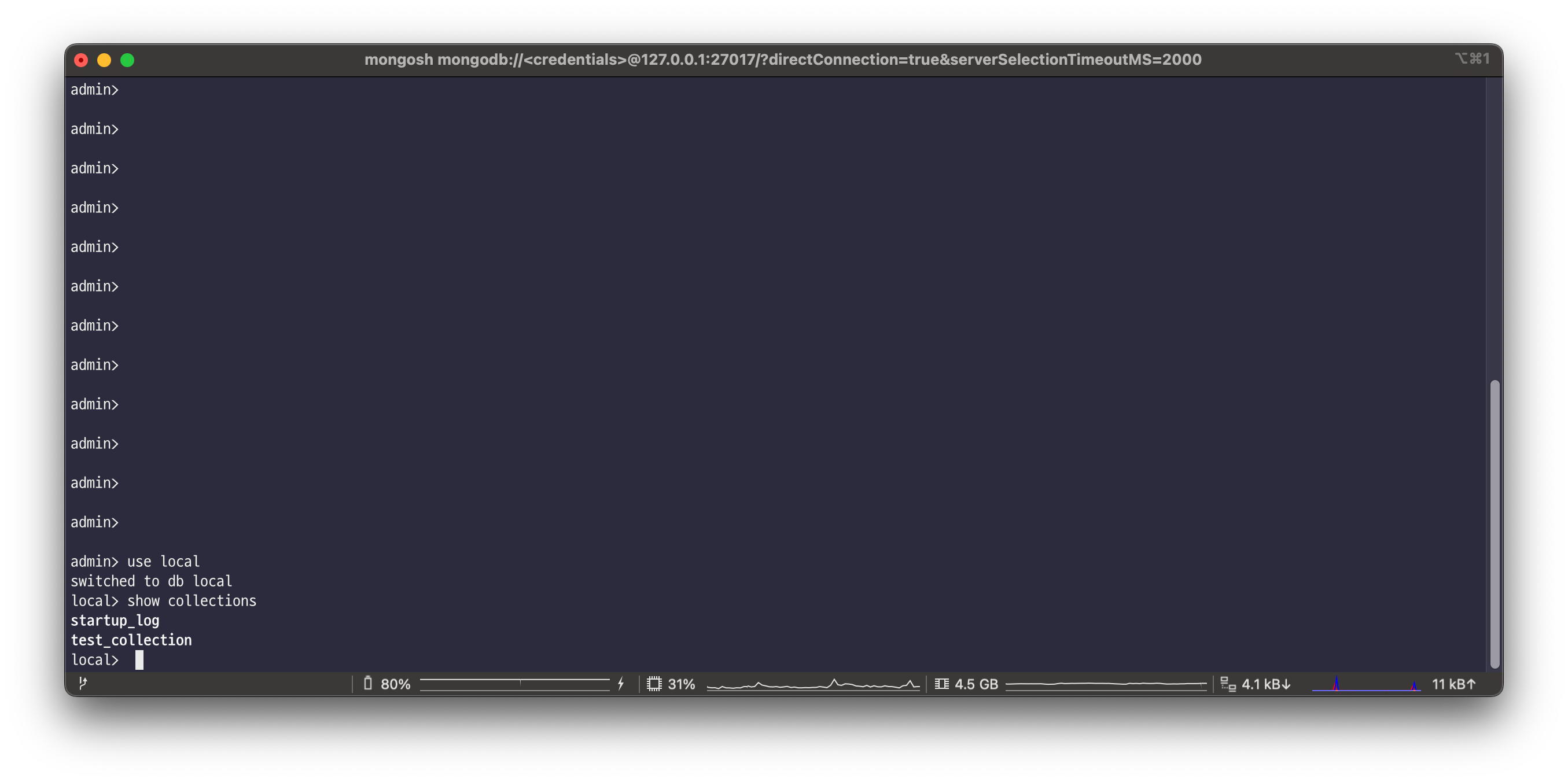 먼저, local 계정에 생성하였으므로 다음 명령어로 사용자를 local로 바꿔주었고, local 계정에 현재 존재하는 collections 내역을 확인했다.