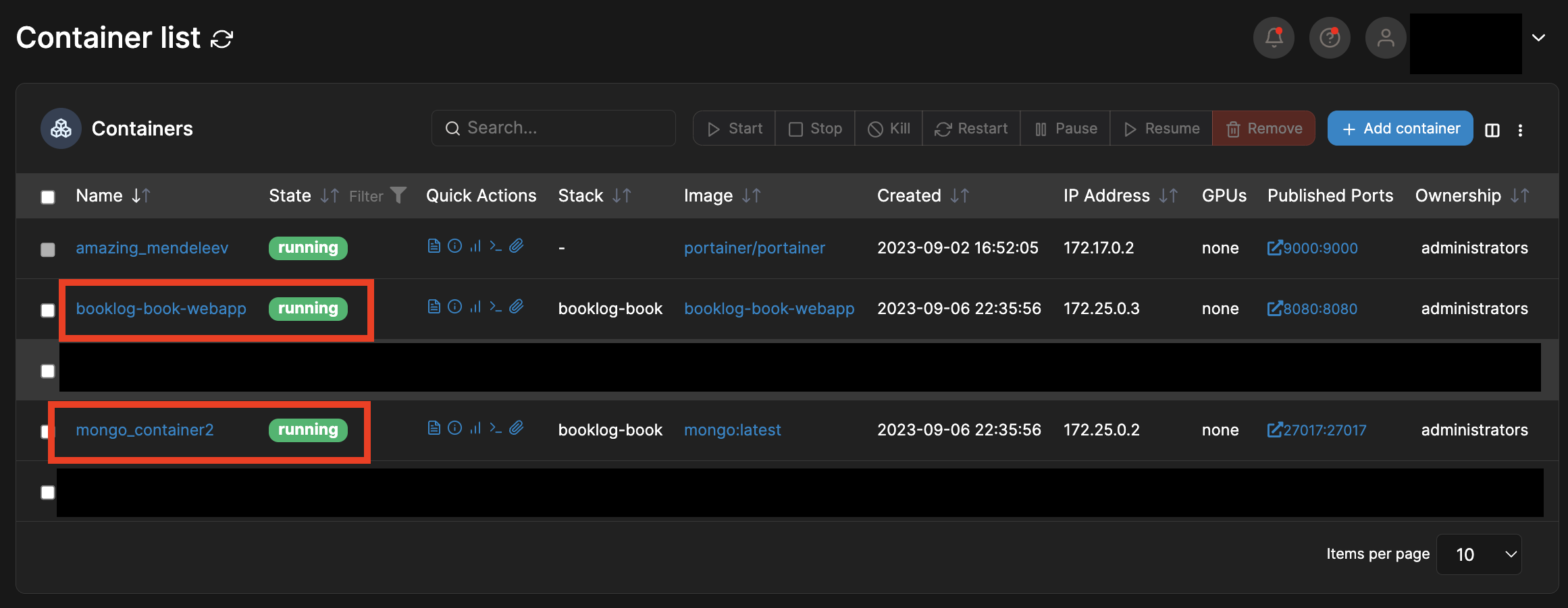 정상적으로 두 컨테이너(mongo container와 spring boot webapp container)가 배포됨을 확인할 수 있다.