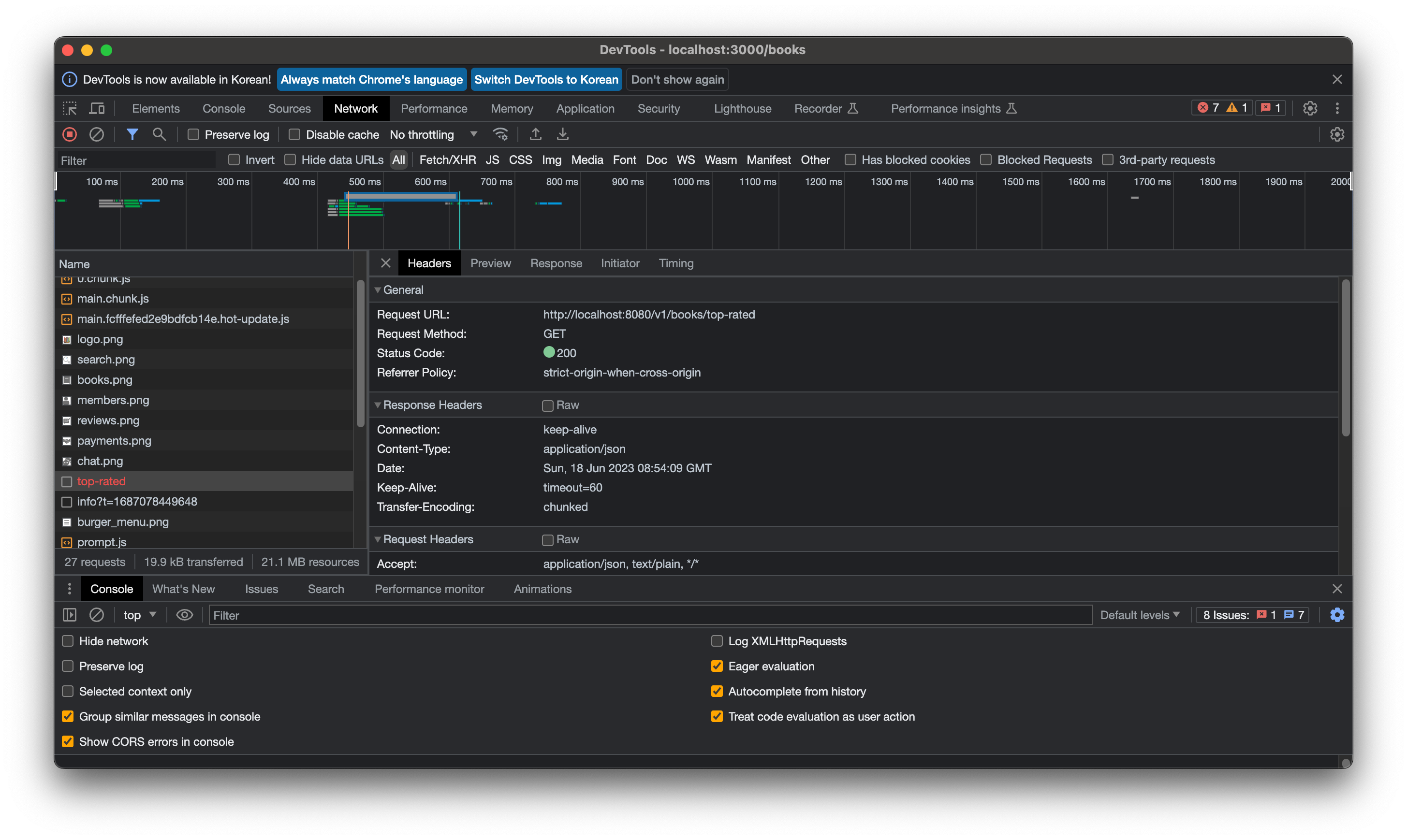 Fail Books top-rated API call:  AxiosError {message: 'Network Error', name: 'AxiosError', code: 'ERR_NETWORK', config: {…}, request: XMLHttpRequest, …}